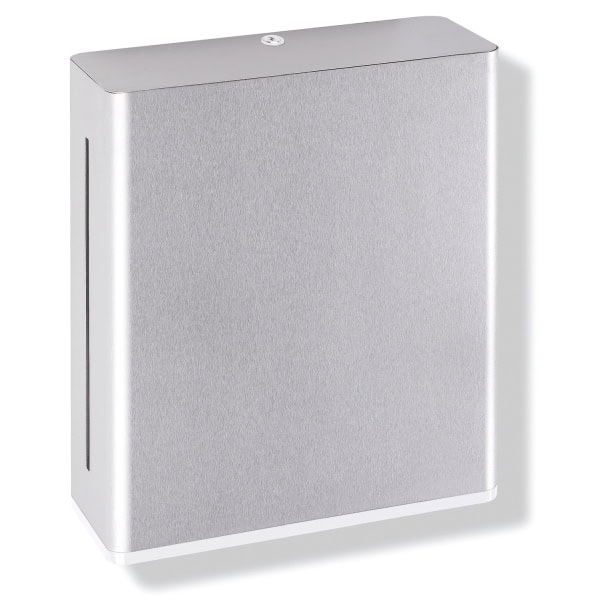 HEWI Range 805 paperipyyheannostelija, kapasiteetti n. 300–450 arkkia, sivulla täyttötason näyttö ja päällä lukitus. Materiaali: satiinipintainen rst, upotettu seinälevy; aukko polyamidia (98 signal white / 99 pure white / 92 anthracite grey / 90 jet black). Mitat: 301 × 360 × 135 mm.