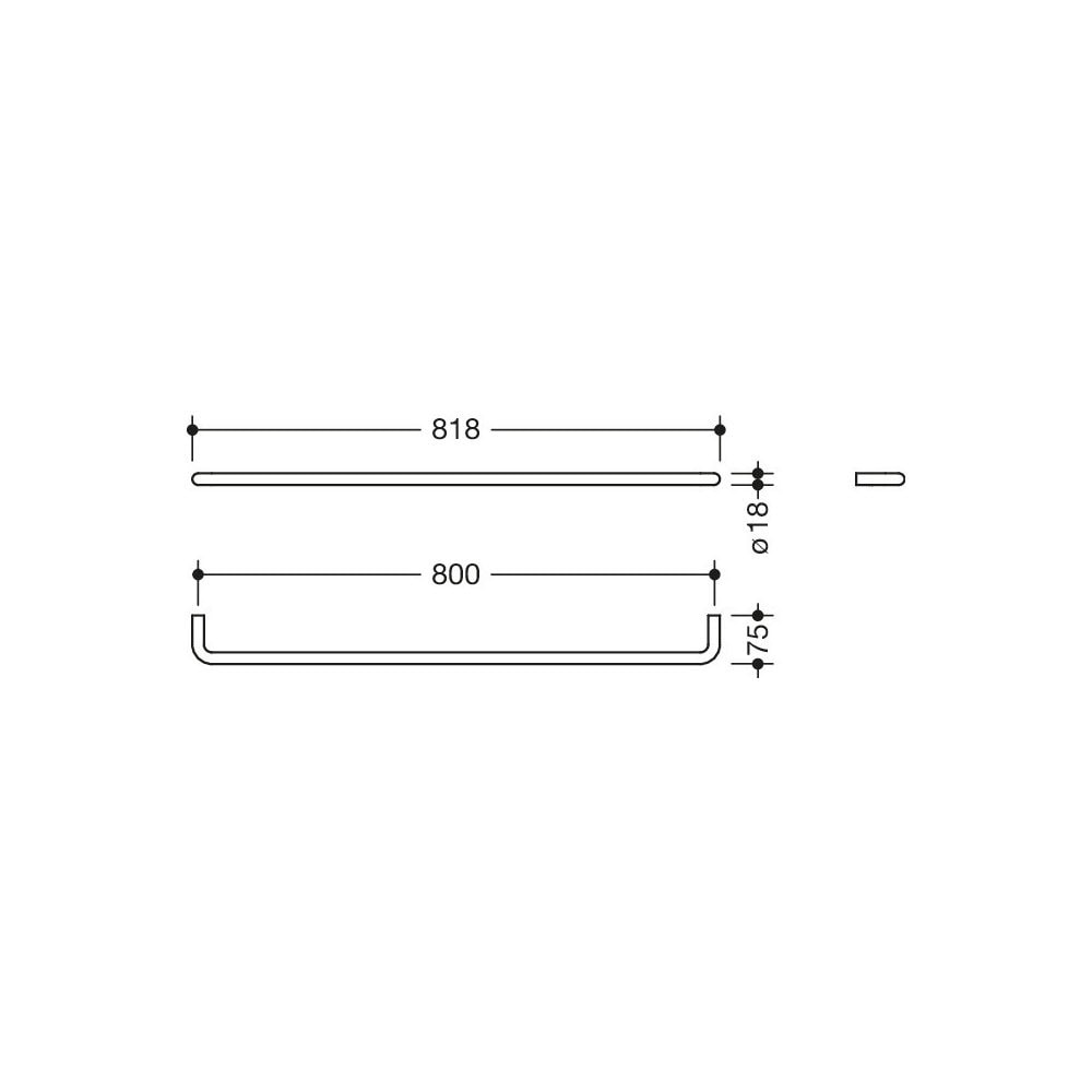 Pyyhetanko, Range 480 – sylinterimäinen tanko kaarevalla seinäkiinnityksellä. Keskiväli 800 mm, syvyys 75 mm, Ø 18 mm. Valmistettu PVD-pinnoitetusta rst:stä. Seinäasennus, piilokiinnitys. Mukana ruostumattomat HEWI-kiinnitystarvikkeet.