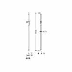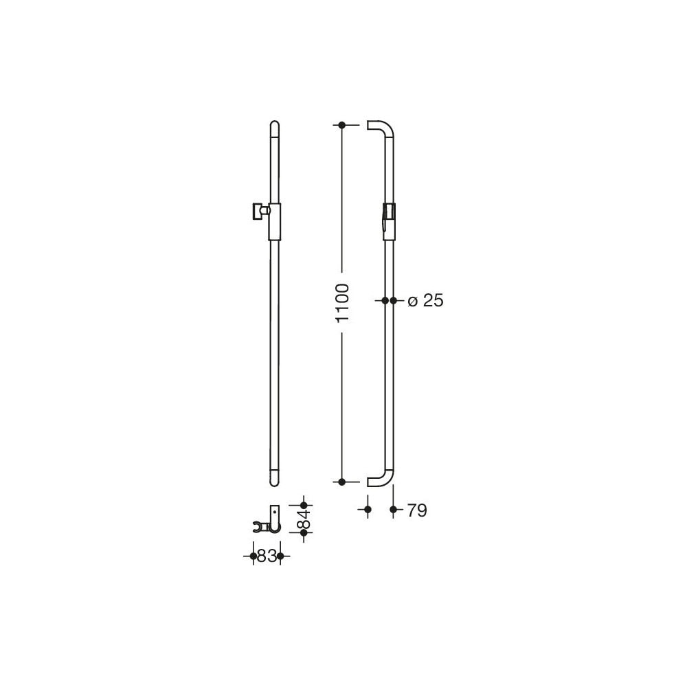 Tukikisko magneettisella käsisuihkun pidikkeellä, Range 480 – pystytanko kaarevalla seinäkiinnityksellä, ilman peitelaattoja. Keskiväli 1100 mm, syvyys 79 mm, Ø 25 mm, putken vahvuus 1,5 mm. Valmistettu PVD-pinnoitetusta rst:stä. Suihkunpidike magneettikiinnitteinen, rst PVD-pinnoite. Sopii useimpiin käsisuihkuihin. Yhden käden käyttö, portaattomasti säädettävä. Automaattinen magneettikiinnitys, kulma säädettävissä. Mukana HEWI:n korroosionkestävät kiinnitystarvikkeet ja tiiviste-elementti porauskohtien tiivistykseen.