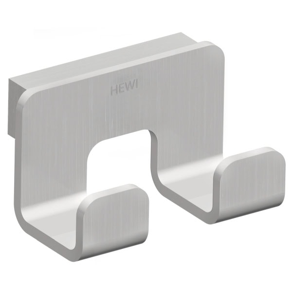 HEWI Range 805 tuplakoukku, suorakulmainen taivutus, upotettu seinälevy. Materiaali: satiinipintainen ruostumaton teräs (3 mm). Mitat: 60 × 36 × 40 mm. Sisältää ruostumattomat kiinnitystarvikkeet.
